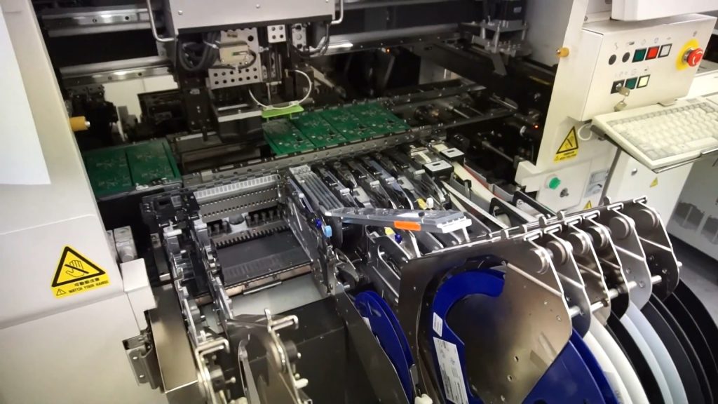 Dies ist ein äußerst komplexer und technisch anspruchsvoller Vorgang, bei dem die gesamte Fertigungsstraße mithilfe von Bestückungsautomaten autonom abläuft. Die auf Spulen befestigten Komponenten werden über entsprechende Spender zugeführt und mithilfe von Bestückungssystemen mit äußerst hoher Präzision auf der Leiterplatte platziert. Die Fertigung einer Leiterplatte umfasst zwar noch weitere Schritte (Bohren, Löten, Härten, optische und manuelle Inspektion usw.), doch das Positionieren der Komponenten ist einer der wichtigsten und gleichzeitig anspruchsvollsten Schritte.