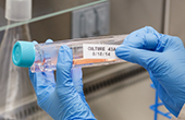 Eine Hand mit einem Handschuh nimmt eine Ampulle aus einem Behälter